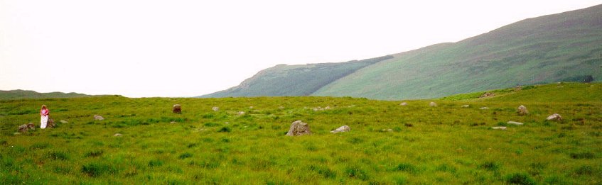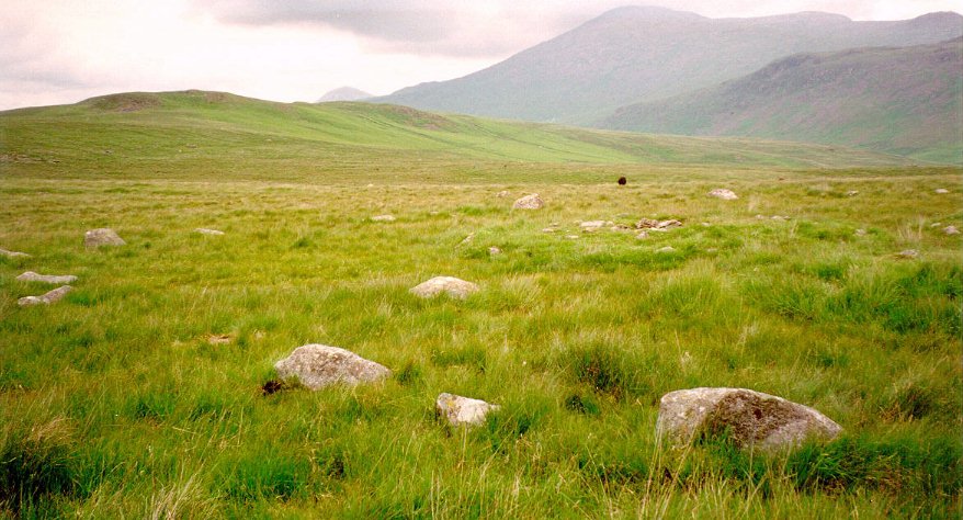 This 32m by 26m circle contains 5 internal cairns and has a very low outlier 10m to the NW. From here you can see the double circle of White Moss about 100m to the NW.