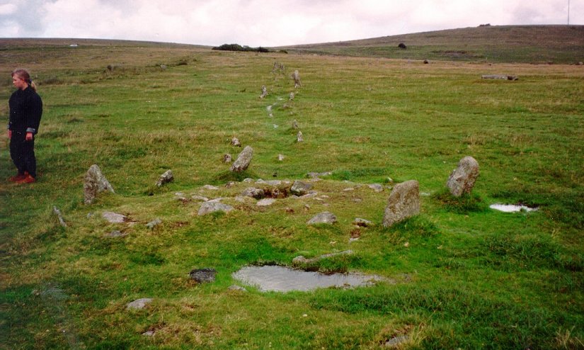 Approximately half way along the avenue is a small circle, less than 4m in diameter, of 7 stones enclosing a despoiled barrow.